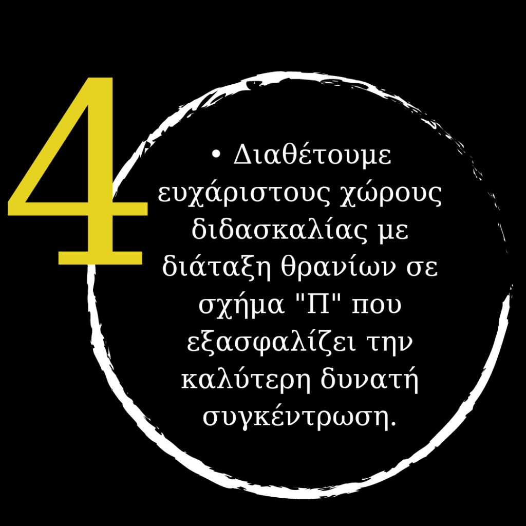 Προκειμένου ο κάθε μαθητής να αποκομίσει το μέγιστο δυνατό από τις παροχές μας και να συγκεντρώσει χρήσιμες ικανότητες για την εκπαιδευτική του σταδιοδρομία, έχουμε οργανώσει ορισμένες τακτικές και δράσεις για να τον βοηθήσουμε να τα καταφέρει.